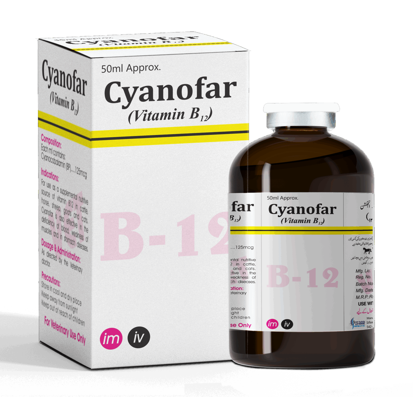 Composition: Each ml contains: Vitamin B12 125mcg For use as a supplemental nutritive source of vitamin B12 in cattle, horse, sheep, goats and cats CYANOFAR is also effective in the deficiency of blood, weakness of muscles and in stomach diseases.