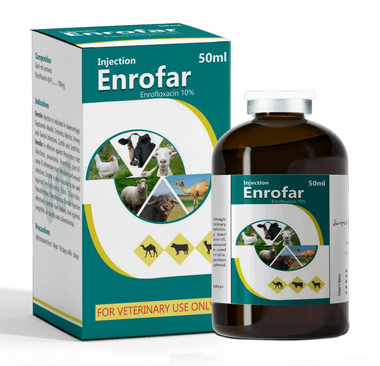 Composition: Each ml contains: Enrofloxacin 100mg ENROFAR injection is indicated in Haemorrhagic Septicemia, Matitis, Enteritis, Metritis, Urinary and Genital Injections, Cystisis and Urethritis. ENROFAR Injection is effective against respiratory tract infections, pneumonia, bronchitis, joint-ill, navel-ill, Alimentary tract infections and wound infections. ENROFAR injection