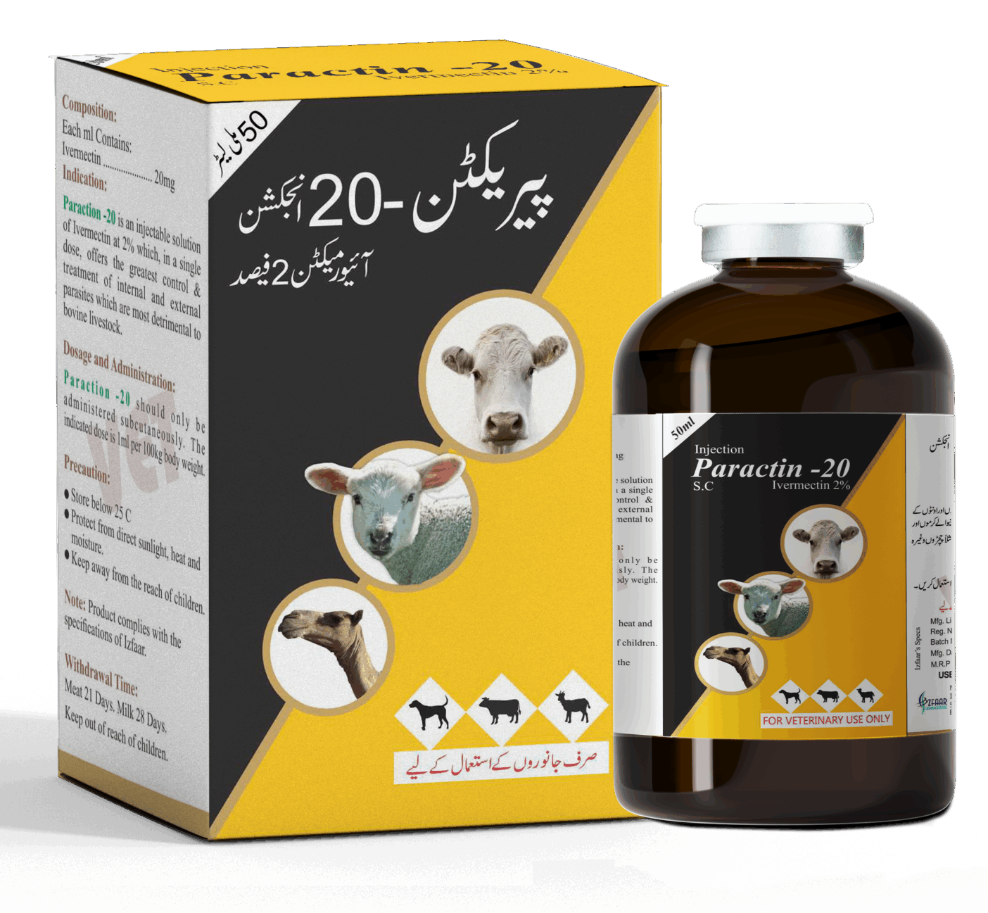 Composition: Each ml contains: Ivermectin 20mg PARACTIN-20 Injectable Solution is used for fighting against lung, eye, nose and wound worms (in parasitic period), gastrointestinal nematodes, warbles, scabies, mites, louses and ticks in cattle, camels, sheep, and goats.