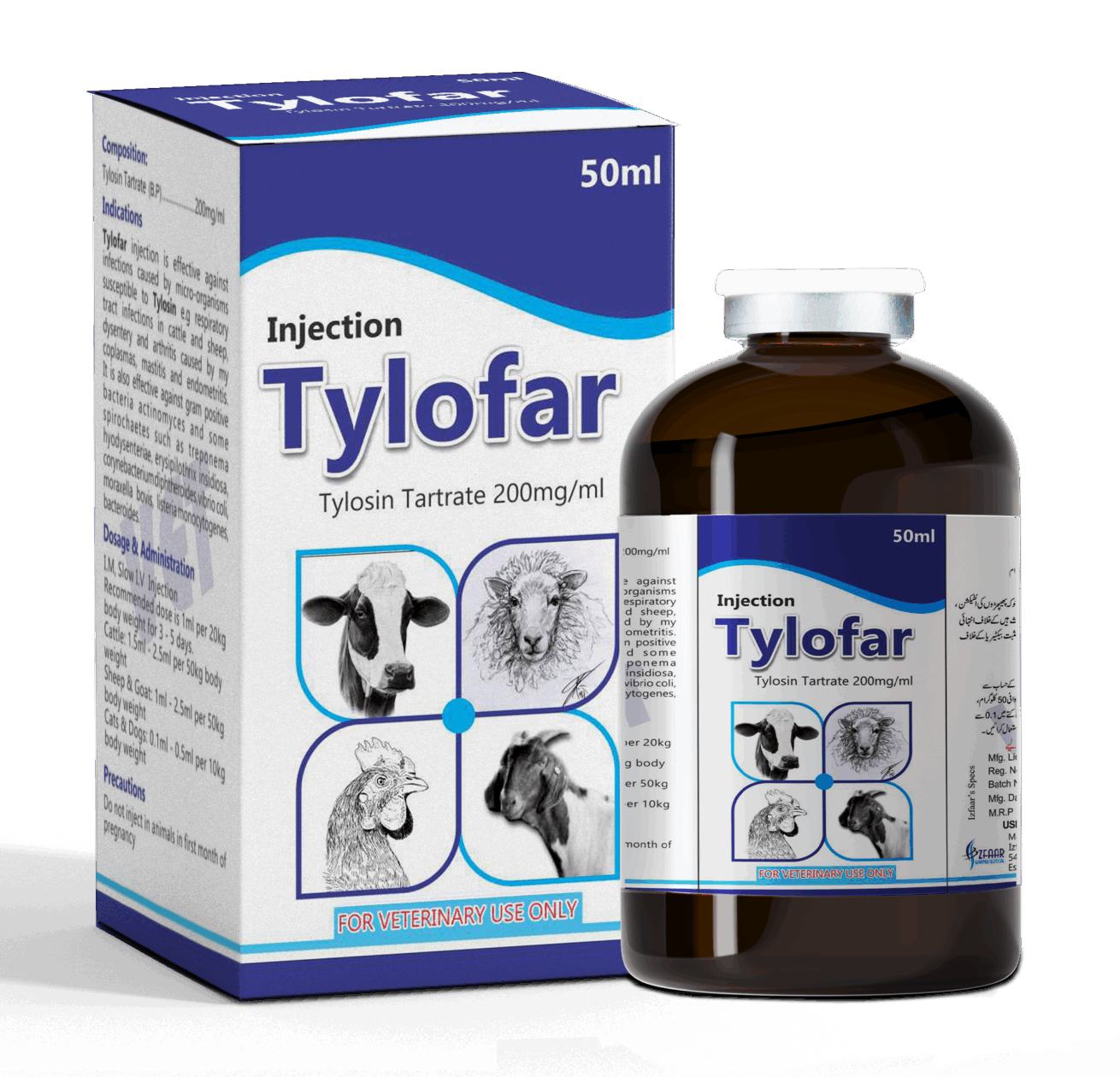 Composition: Each ml contains: Tylosin Tartrate 200mg TYLOFAR injection is used for the treatment of respiratory (especially pleuropneumonia infections, laryngitis, pharyngitis, tonsillitis), gastrointestinal and urogenital system infections (metritis), including