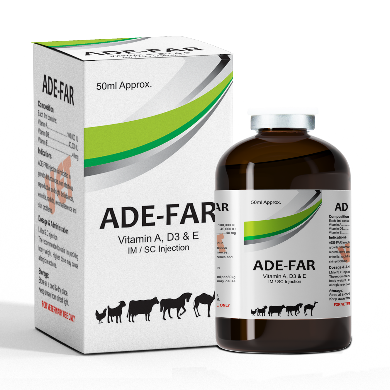 ADE-FAR Injectable Solution is used in cattle, horses, sheep and goats for making up the deficits of A, D3 and E vitamins and also in the treatment of the diseases associated with such deficits. Additionally, it is used in the treatment of the diseases like rickets in young animals and osteomalaciain adults resulting from vitamin deficiencies in the foods and in supplying the increased needs for A, D3 and E vitamins.