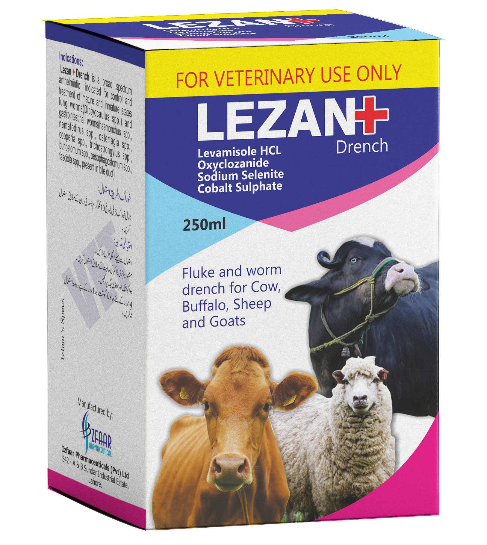 Composition: Each ml contains:Levamisole HCL B.P.Vet 15mg Oxyclozanide B.P.Vet 30mg Sodium Selenite (B.P.Vet) 1.67mg Cobalt Sulphate (M.S) 0.5mg LEZAN + Drench is a broad spectrum anthelmintic indicated for control and treatment of mature and inmature states lung worms (Dictyocaulus spp.) and gastrointestinal worms(haemonchus spp., nematodirus spp., ostertagia spp., cooperia spp., trichostrongylus spp., b u n o s t o m u m s p p . , o e s o p h a g o s t o m u m s p p . , fasciola spp., present in bile duct).