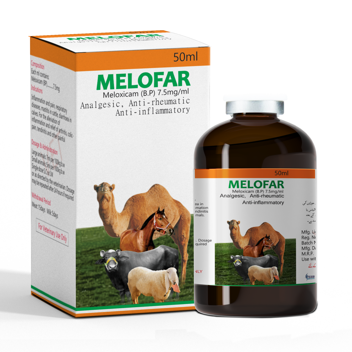 Composition: Each ml contains: Meloxicam 7.5mg MELOFAR Injectable is used to obtain analgesic, antipyretic and anti-rheumatic effects in horses, unweaned calves, weaned calves, cattle, sheep, goats, cats and dogs. In cattle, it is used to reduce the clinical symptoms in the acute respiratory tract infections, in addition to the antibiotic treatments. For the cases of diarrhea in cattle, which are not in lactation period, young cattle and one-week old calves, it may be combined with oral dehydration treatment to reduce